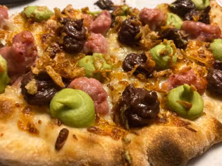 La pizza est formada per una base blanca coberta de mozzarella Fior di Latte i llonganissa, amb una crema de botifarra, un cremós de faves, ceba cruixent i flambeada amb gel de timó com a "toc especial".