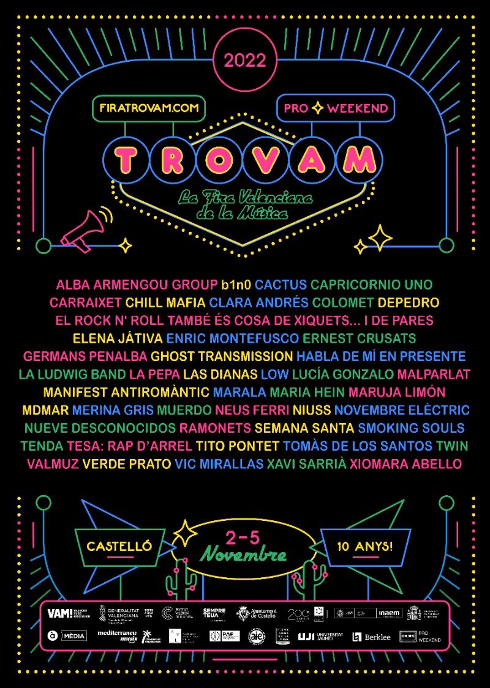 La Fira Valenciana de la Música Trovam ha donat a conéixer la programació artística completa de la seua desena edició que tindr lloc entre el 2 i el 5 de novembre a Castelló de la Plana. Més de 40 artistes formen part d'un cartell que omplir de música les diverses sales de l'Auditori i Palau de Congressos de Castelló així com diferents punts de la capital de la Plana Alta. Als noms ja coneguts de Xavi Sarri, Smoking Souls, Depedro, Carraixet, Marala o Low, ara s'uneixen altres intrprets com Tesa, Colomet, La Ludwig Band, Muerdo, Chill Mafia o Las Dianas.