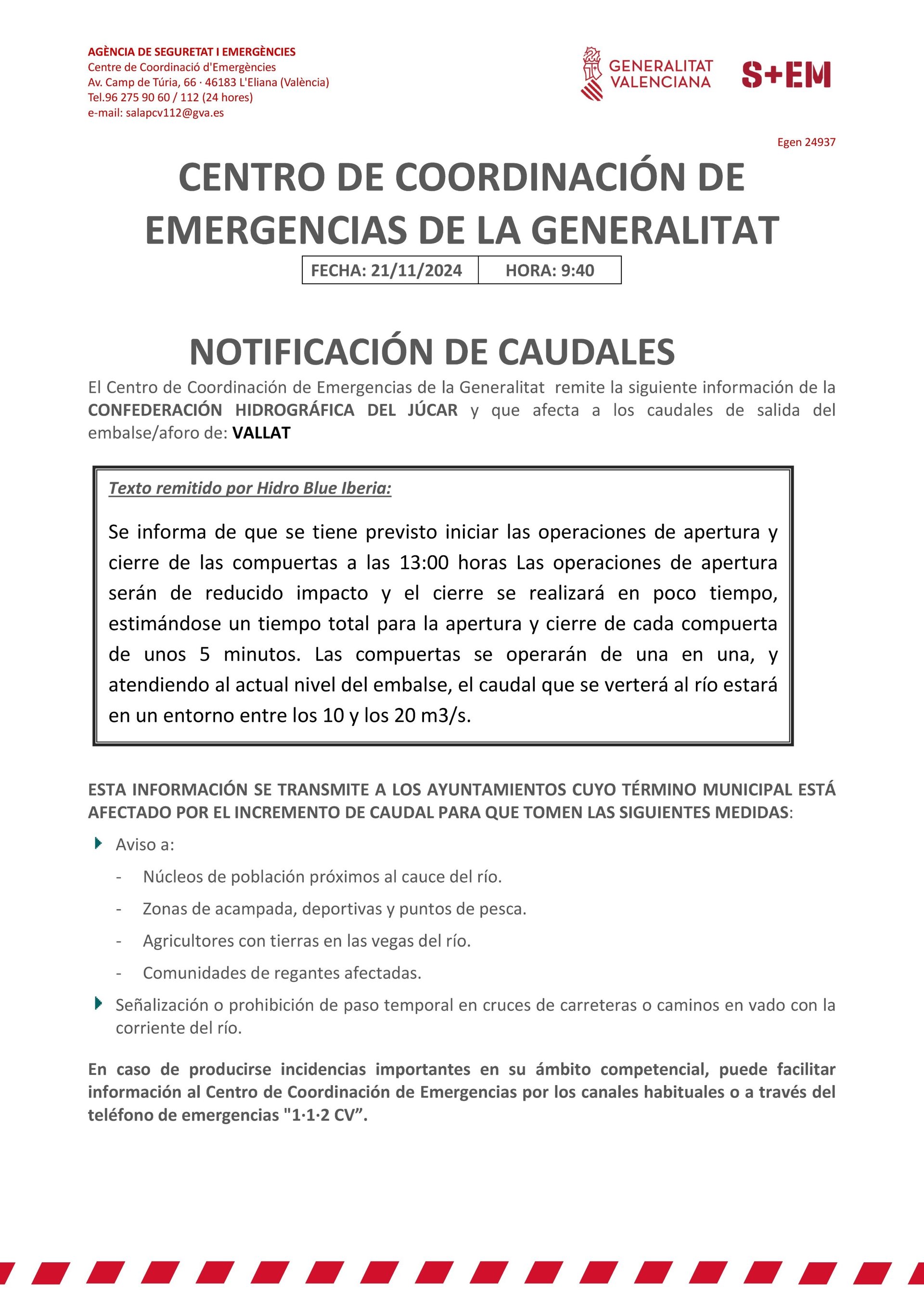 Segons arreplega el Centre de Coordinació d'Emergències (CCE), s'ha remès la informació de la CHJ que afecta als cabals d'eixida de l'embassament de Vallat als ajuntaments de la zona.