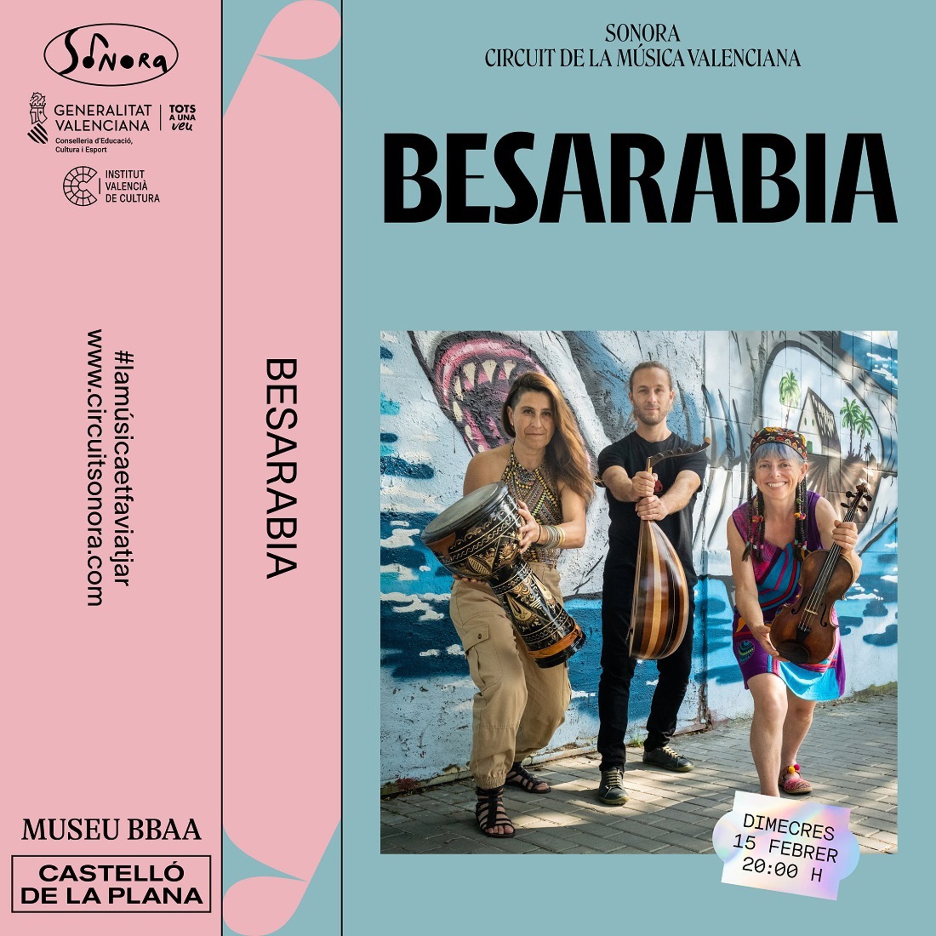 El grup Besarabia arribar al Museu de Belles Arts de Castelló el dimecres 15 de febrer a les 20.00 hores, amb accés gratut. Inspirats en la música del Mediterrani i els Balcans, Besarabia han desenvolupat el seu particular estil interpretant canons tradicionals i també han creat les seues prpies composicions, combinant i fusionant sons balcnics i mediterranis amb lletres valencianes i elements més moderns.