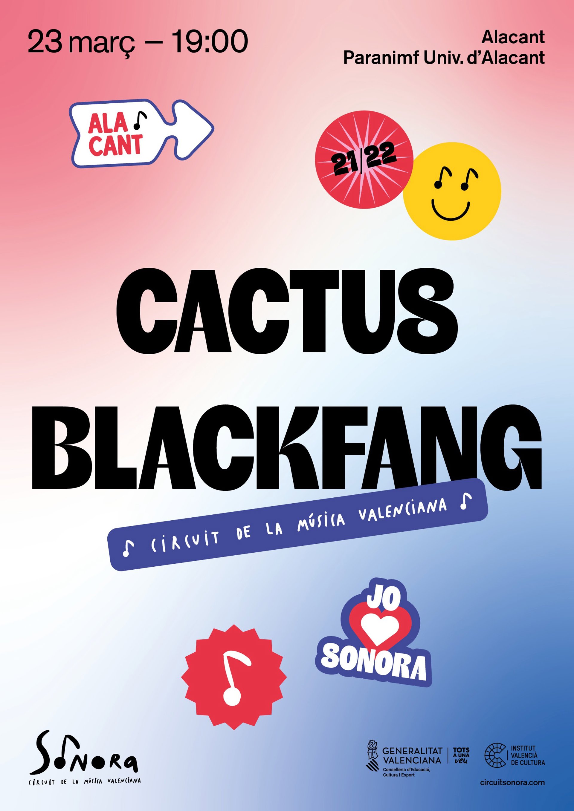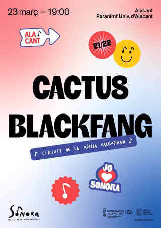 Sonora, el circuit de la música valenciana organitzat per l'Institut Valenci de Cultura (IVC), continua aquesta setmana a Alacant amb el doble concert de música urbana dels grups Cactus i Blackfang, que tindr lloc en el Paranimf de la Universitat d'Alacant el dimecres 23 de mar a les 19.00 hores, segons han informat fonts de la Generalitat.