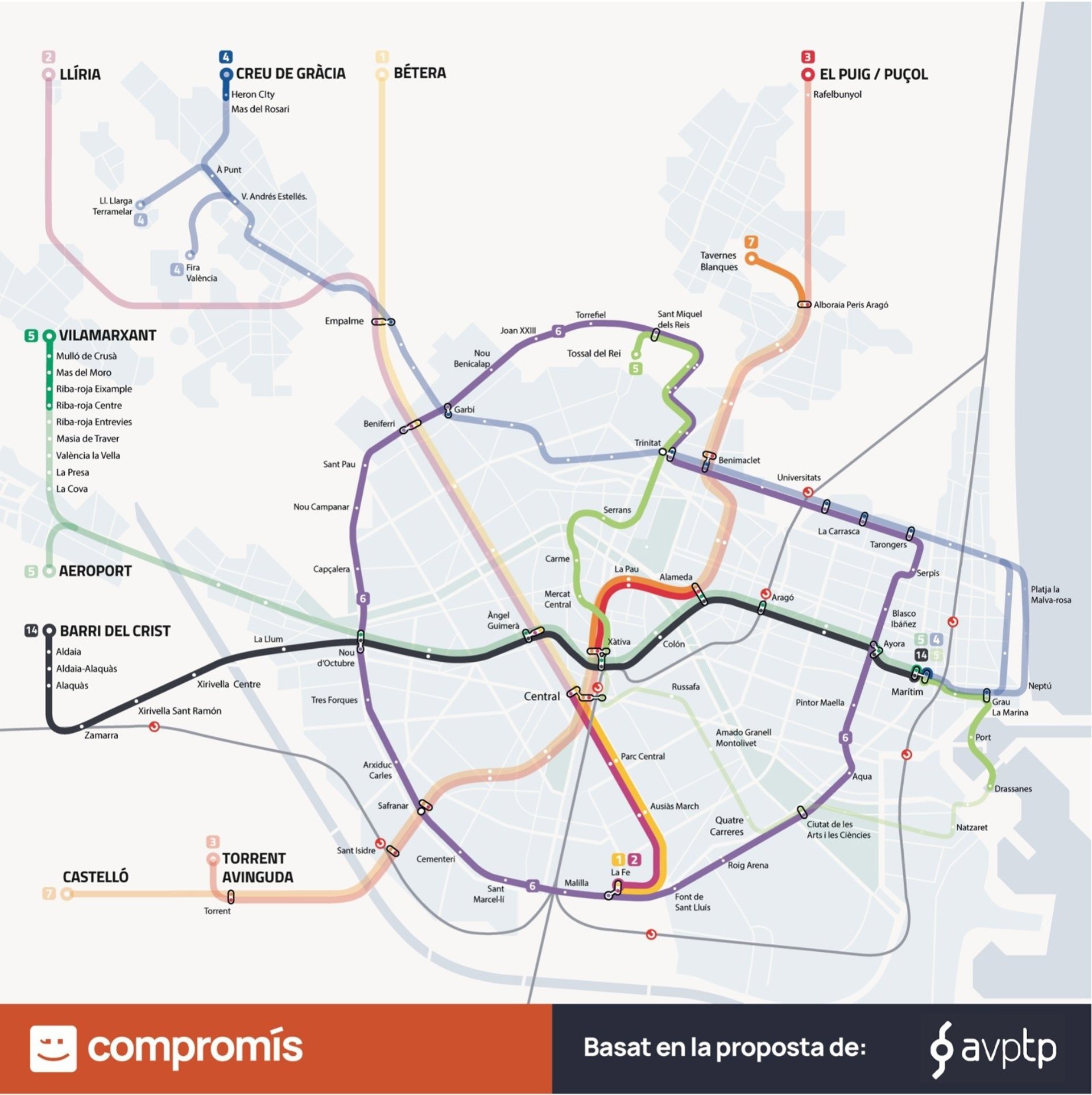 Compromís ha proposat una extensió de la xarxa de Metrovalencia fins el 2035 que inclou la prolongació de les línies 1 i 2 des d'ngel Guimer fins a l'Hospital La Fe; la reconversió de la línia 6 en un tramvia orbital; connectar la Línia 10 amb Pont de Fusta i el Cabanyal, i que el nou túnel entre Albereda i Bailén discórrega per davall del carrer La Pau.