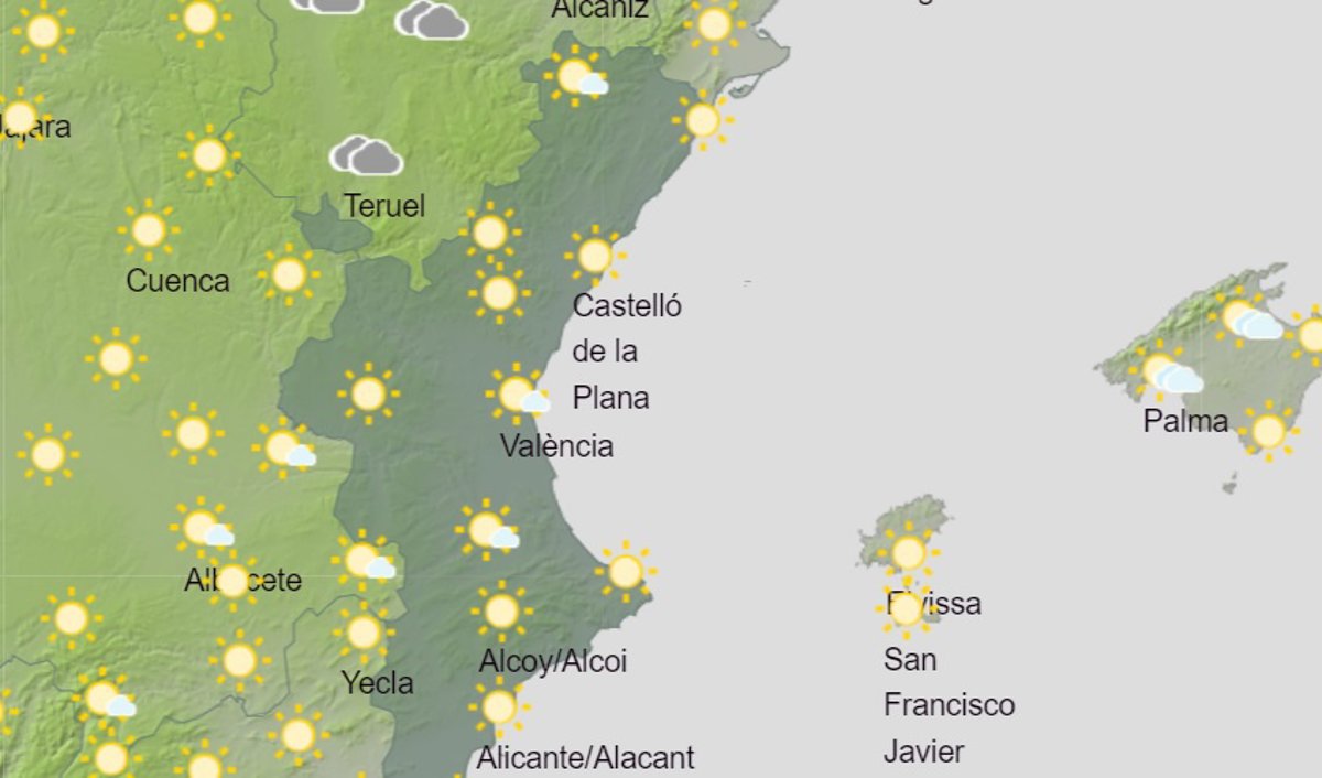 A la ciutat d'Alacant les temperatures oscil·laran entre els 14 i 22 graus; a Castelló de la Plana, entre els 13 i els 23 i a València, de 15 a 23 de màxima.