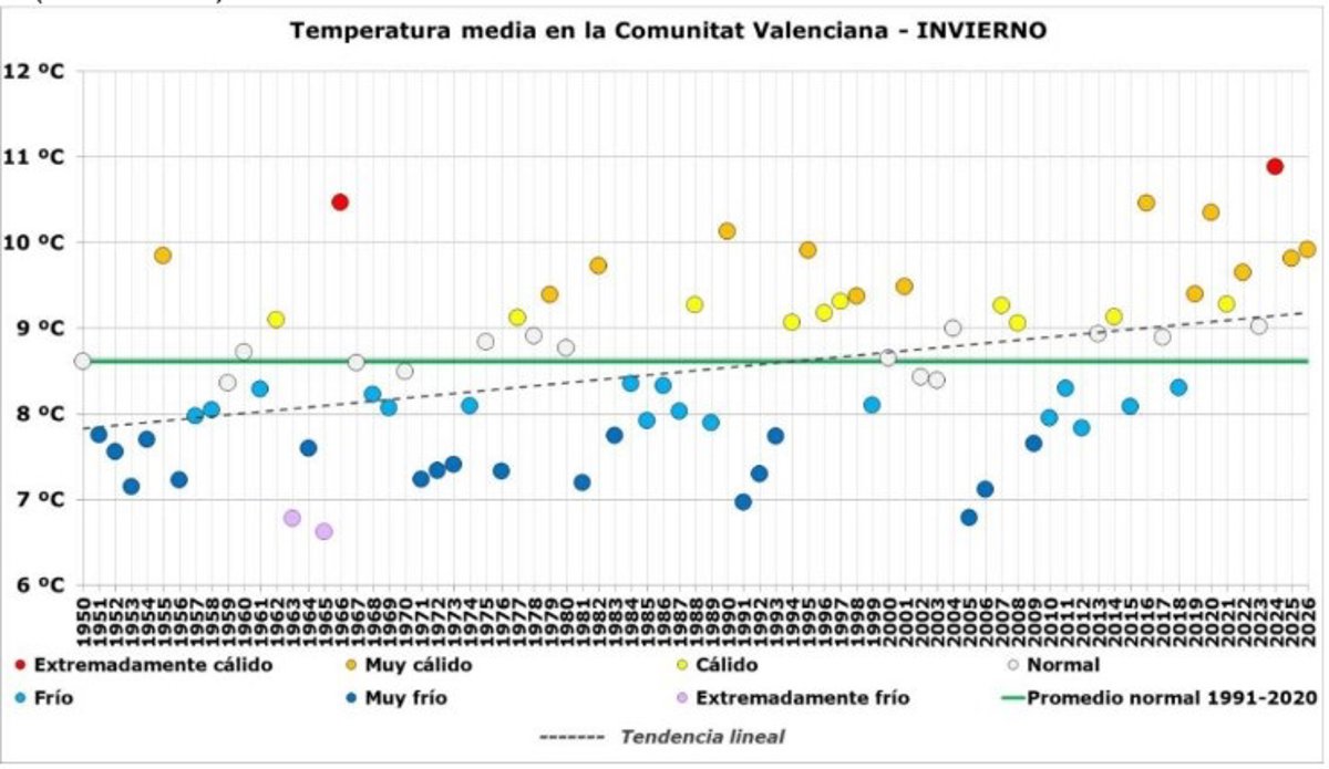 La temperatura mitjana del trimestre ha sigut de 9,9 graus, 1,3 graus per sobre del normal (8,6º), la qual cosa situa a este hivern com el sisè més càlid i el tretzè més humit des d'almenys 1950.