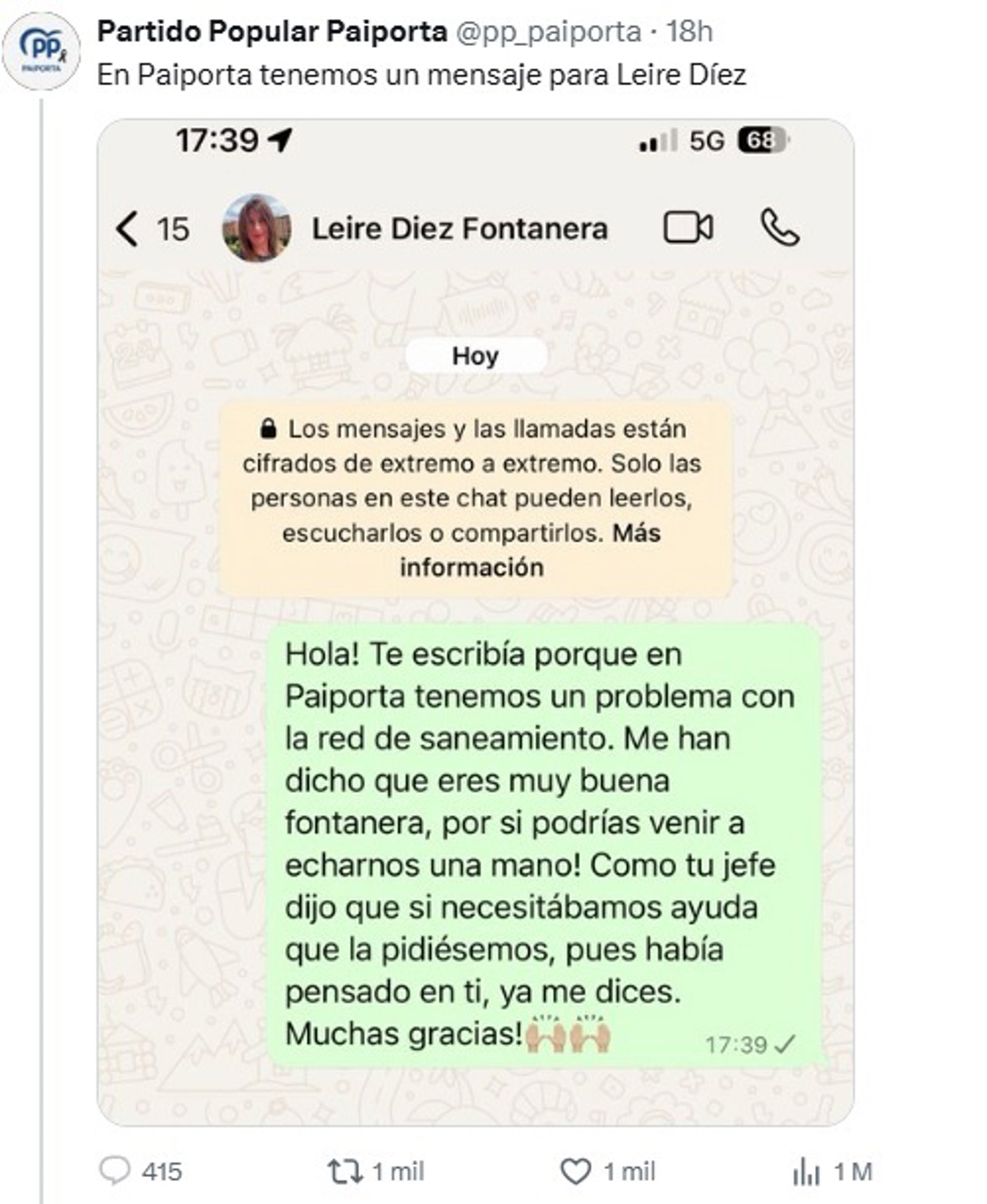 En un missatge publicat este dimecres en la xarxa social X, el PP de Paiporta es dirigix d'esta manera a Díez: "Hola! T'escrivia perquè a Paiporta tenim un problema amb la xarxa de sanejament. M'han dit que eres molt bona lampista, per si podries vindre a tirar-nos una mà! Com el teu cap va dir que si necessitàvem ajuda que la demanàrem, doncs havia pensat en tu. Ja em dius".