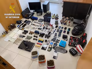 Entre el material recuperat es va localitzar un arma curta de tir esportiu, així com 150 telfons mbils i 15 comandaments d'obertura de diferents garatges de comunitats de vens. Posteriorment en un magatzem proper i propietat de l'ara detingut hi havia una plantació 'indoor' de marihuana, amb 71 plantes i d'elles 51 en creixement.