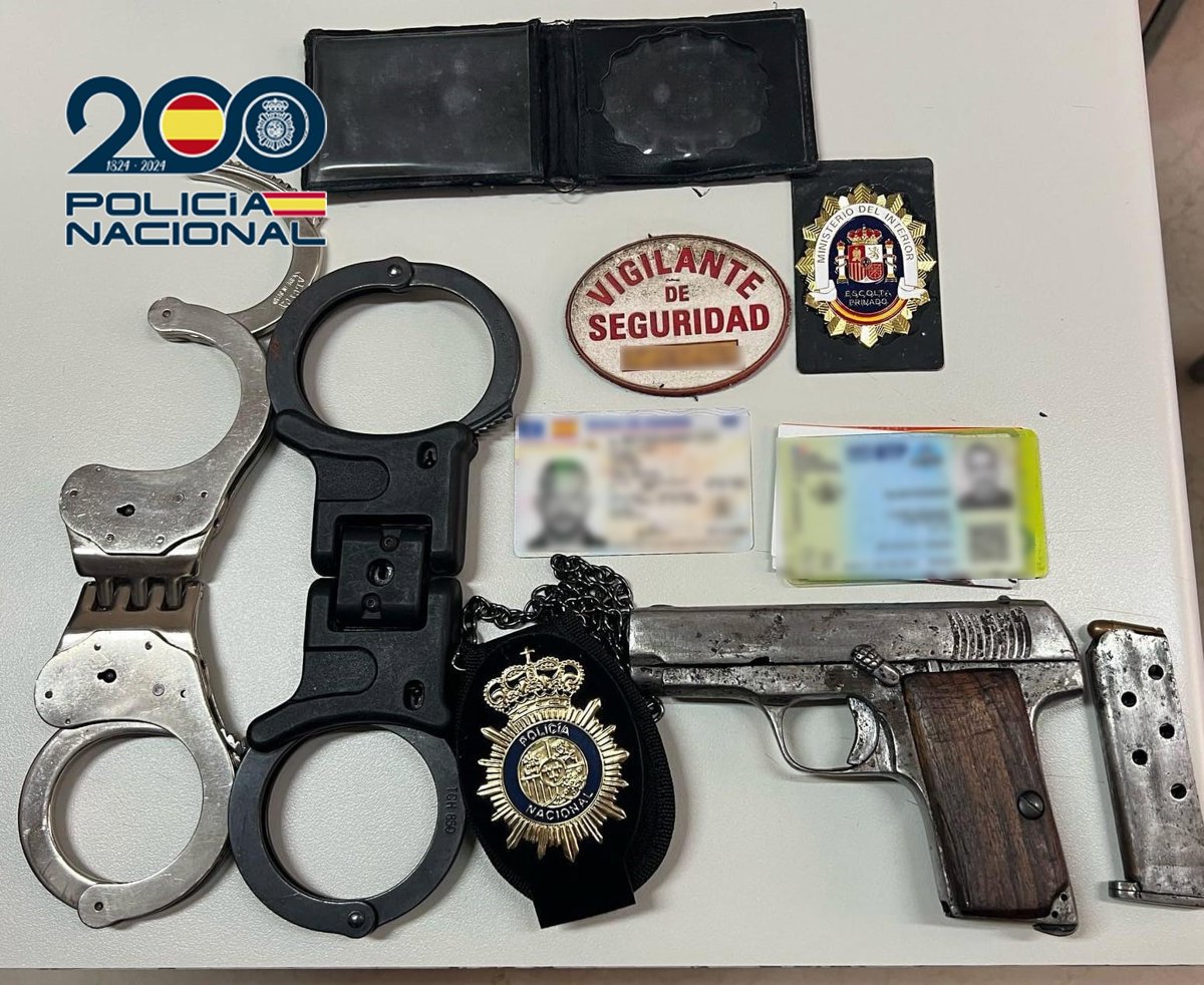 A més, el mateix portava entre les seues pertinences dos tornavisos, dos parells de grilletes, un barret fort amb una clau, una llanterna curta cinturons, dos telèfon mòbils, unes claus per a obrir grilletes, una cartera amb documentació personal que contenia quasi 500 euros, una identificació de vigilant de seguretat, una placa identificativa d'escorta, un portaplacas de coll en el qual es trobava un emblema de plàstic de la Policia Nacional i una faixa adherida al seu cos en la qual es trobava una pistola platejata contenint el seu carregador amb dos cartutxos.