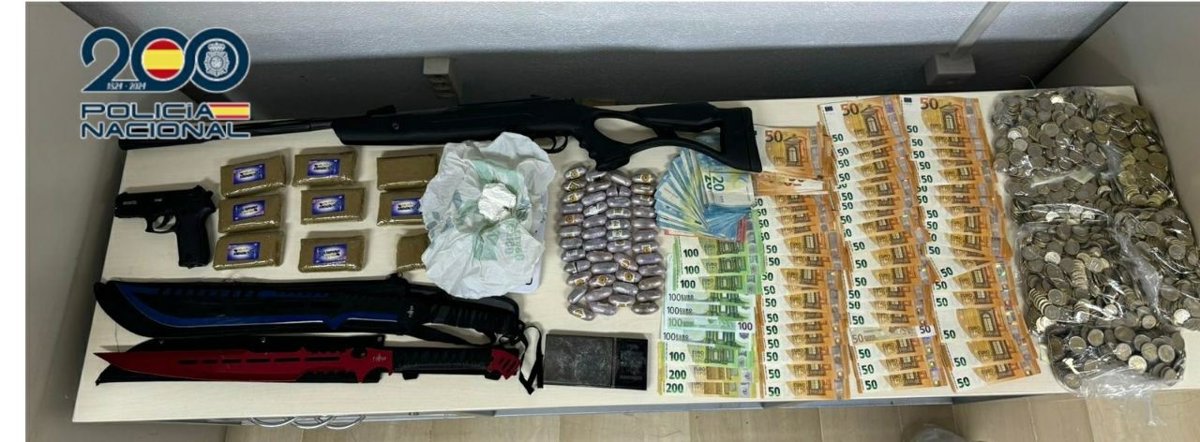 En els registres practicats els agents van intervenir 49 grams de cocana, uns 1.300 grams de haixix, 9.825 euros fraccionats en bitllets i monedes, una balana de precisió, dues armes de perdigons, dues armes blanques i diversos útils de manipulació per a la venda de substncies estupefaents.