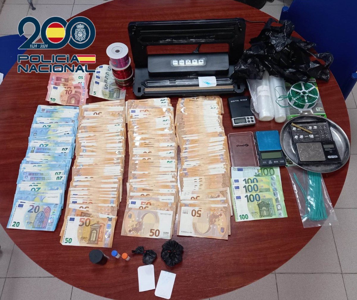 Per aquests fets es van dur a terme entrades i registres en els domicilis de tots dos implicats on van localitzar 50 grams de cocana, quasi 20.000 euros en efectiu, així com tres balances de precisió, una mquina d'envasament de restes d'aquesta substncia i diversos útils per a la preparació de les dosis.