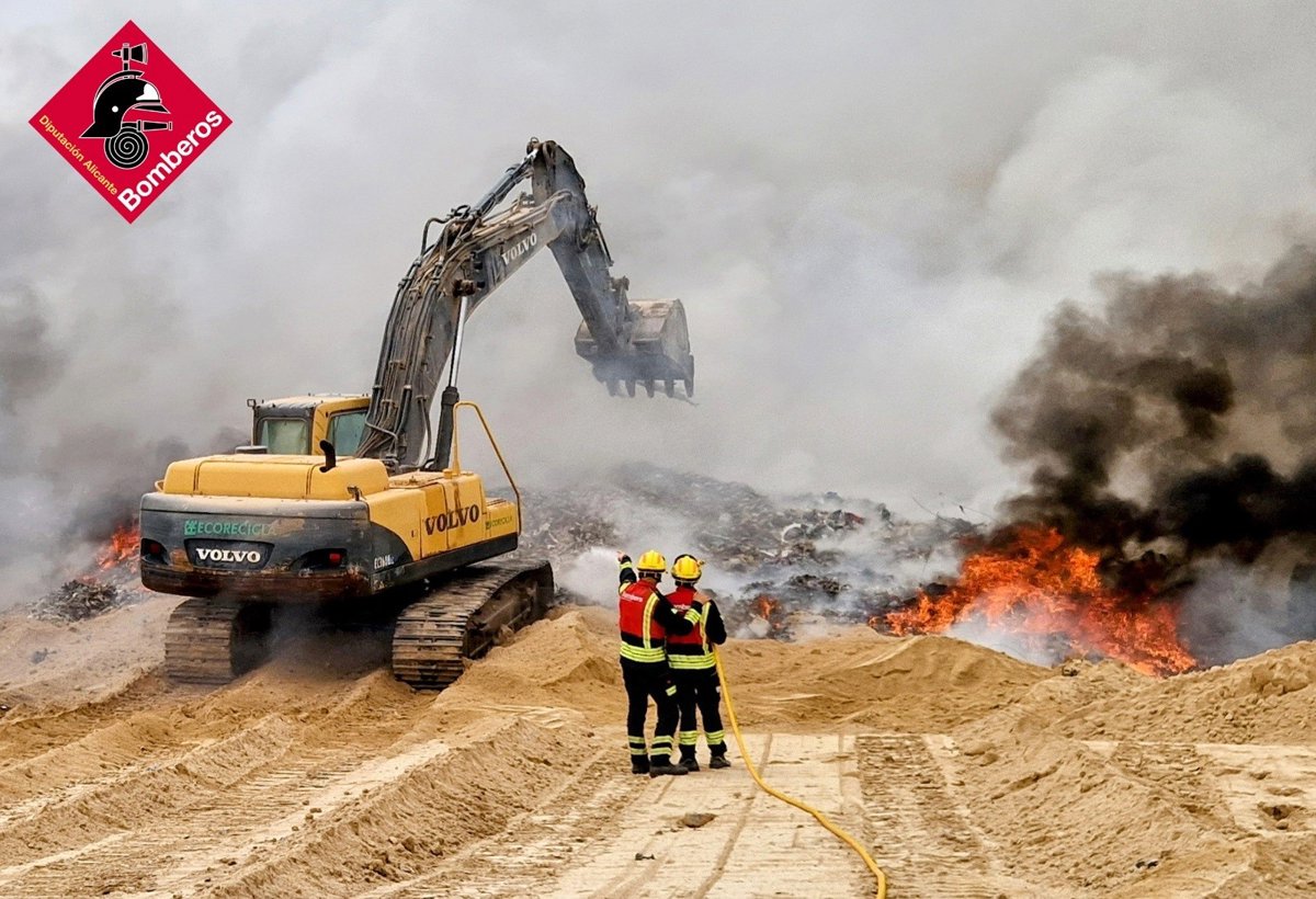 Efectius del Consorci Provincial de Bombers d'Alacant continuen treballant en l'extinció de l'incendi que es va declarar el diumenge a la vesprada en l'abocador Piedra Negra, al terme municipal de Xixona, amb retroexcavadores i buldzers.
