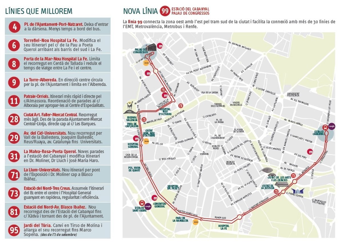 Els canvis també afectaran les línies 73 i 81: la 81 mantindrà la seua freqüència i desdoblarà el seu recorregut --actualment entre Blasco Ibáñez i l'Hospital General-- i arribarà fins a l'Estació del Nord i el carrer Sant Vicent Màrtir.