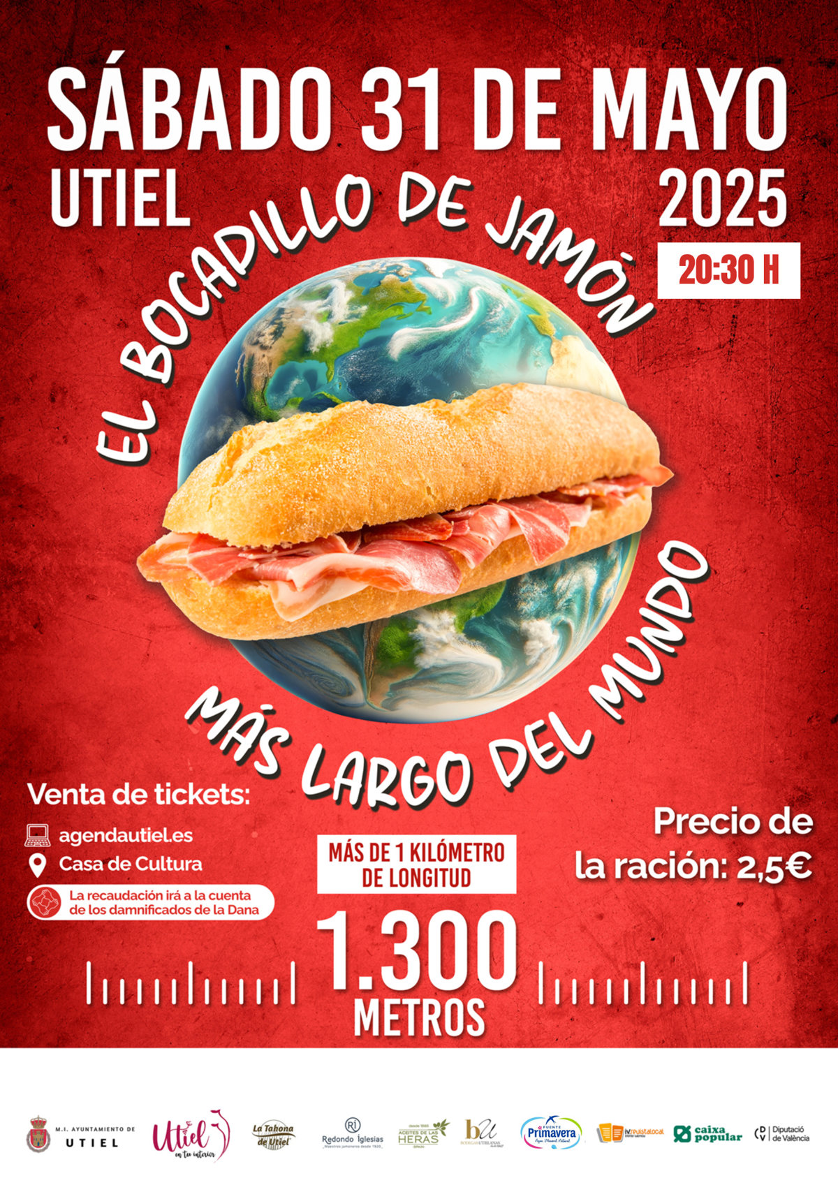 L'Ajuntament d'Utiel, en col·laboració amb diferents empreses i institucions, traurà al carrer l'entrepà gegant per a convertir-se en el més llarg del món que recorrerà les principals zones del centre d'Utiel aquest dissabte a partir de les 20.30 hores, "conjuminant la passió per la gastronomia local amb la solidaritat", segons el comunicat.