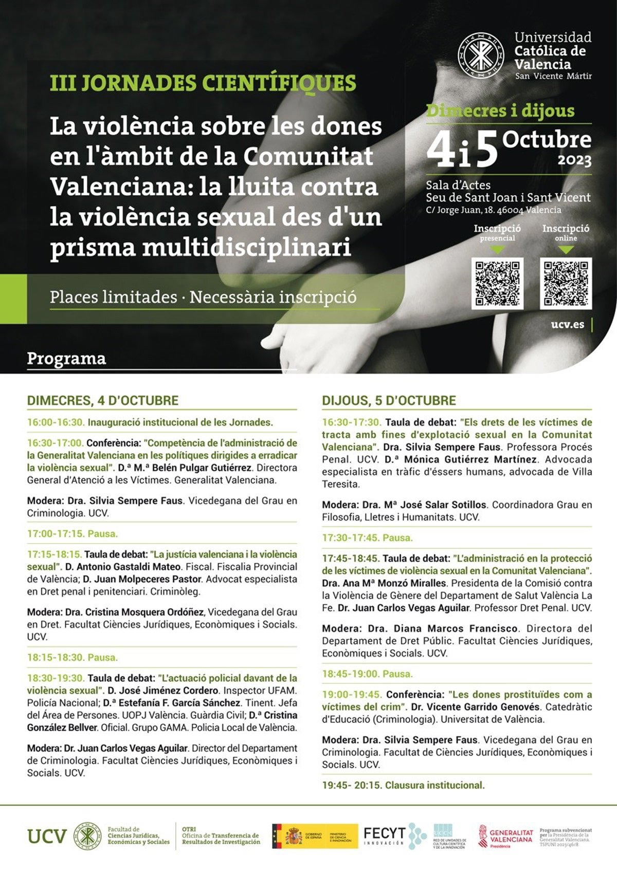 La Facultat de Cincies Jurídiques, Econmiques i Socials de la Universitat Catlica de Valncia (UCV), en collaboració amb el Ministeri de Cincia i Innovació i Presidncia de la Generalitat Valenciana, celebrar a partir d'aquest dimecres i fins al dijous les III Jornades Científiques 'La Violncia sobre les dones en l'mbit de la Comunitat Valenciana: la lluita contra la violncia sexual des d'un prisma multidisciplinari'.