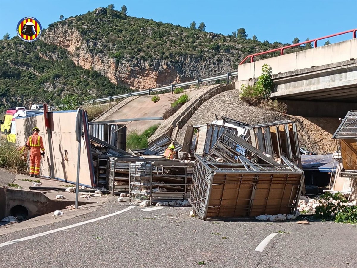 Un home de 41 anys, conductor d'un camió, ha resultat ferit amb politraumatisme en xocar el seu vehicle contra un mur en la carretera CV-35 a Calles. El camió transportava càrrega avícola i el sinistre ha provocat l'alliberament de múltiples animals en el lloc.
