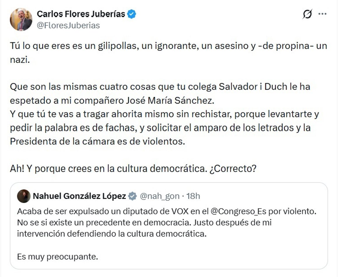 El diputat de Vox Carlos Flores Juberías ha usat el seu compte en la xarxa social X per a ratllar de "tocacollons" i de "nazi" al parlamentari de Sumar Nahuel González, al·legant que estos mateixos insults van ser rebuts pel seu company José María Sánchez García abans de ser expulsat este dimarts de l'hemicicle per encarar-se amb una lletrada i amb la presidència de la Càmera.