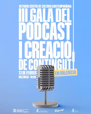 La III Gala del Pòdcast i Creació de Contingut en Valencià se celebra el pròxim 13 de febrer de 2026 a l'Octubre CCC de València i hui dimarts s'obri el termini per a presentar les sol·licituds, el qual romandrà obert fins al dia 30 del mateix mes.