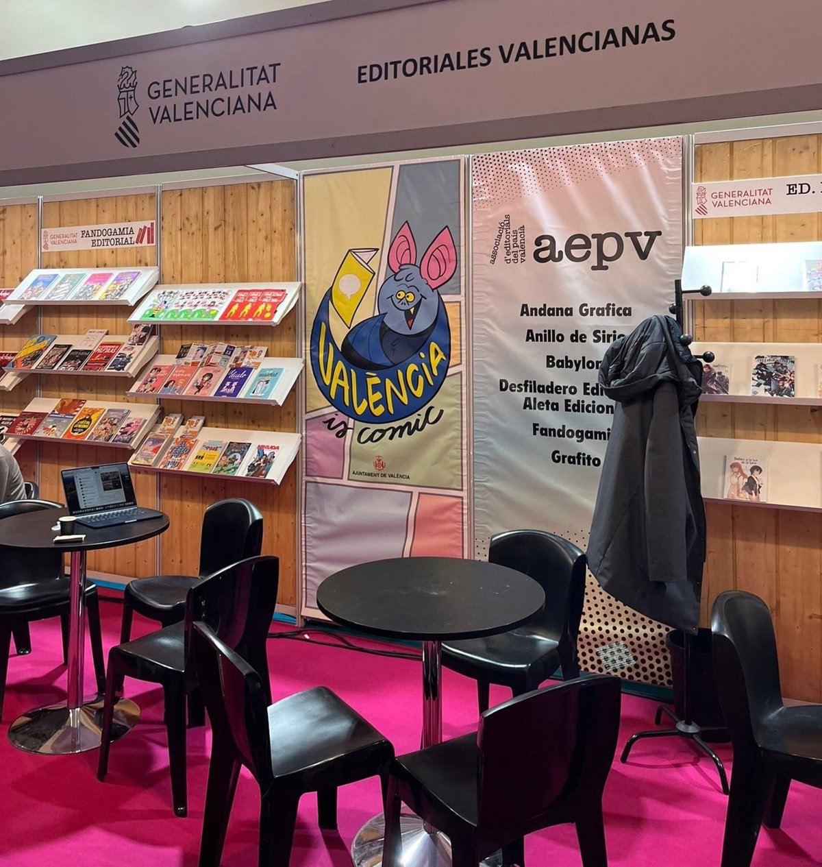 A l'espai expositiu contractat per l'Administració Pública, l'expedició valenciana estarà representada per Andana Gràfica, Grafito Editorial, Ediciones Babylon, Anillo de Sirio, Fandogamia Editorial i Desfiladero Ediciones - Aleta Ediciones.