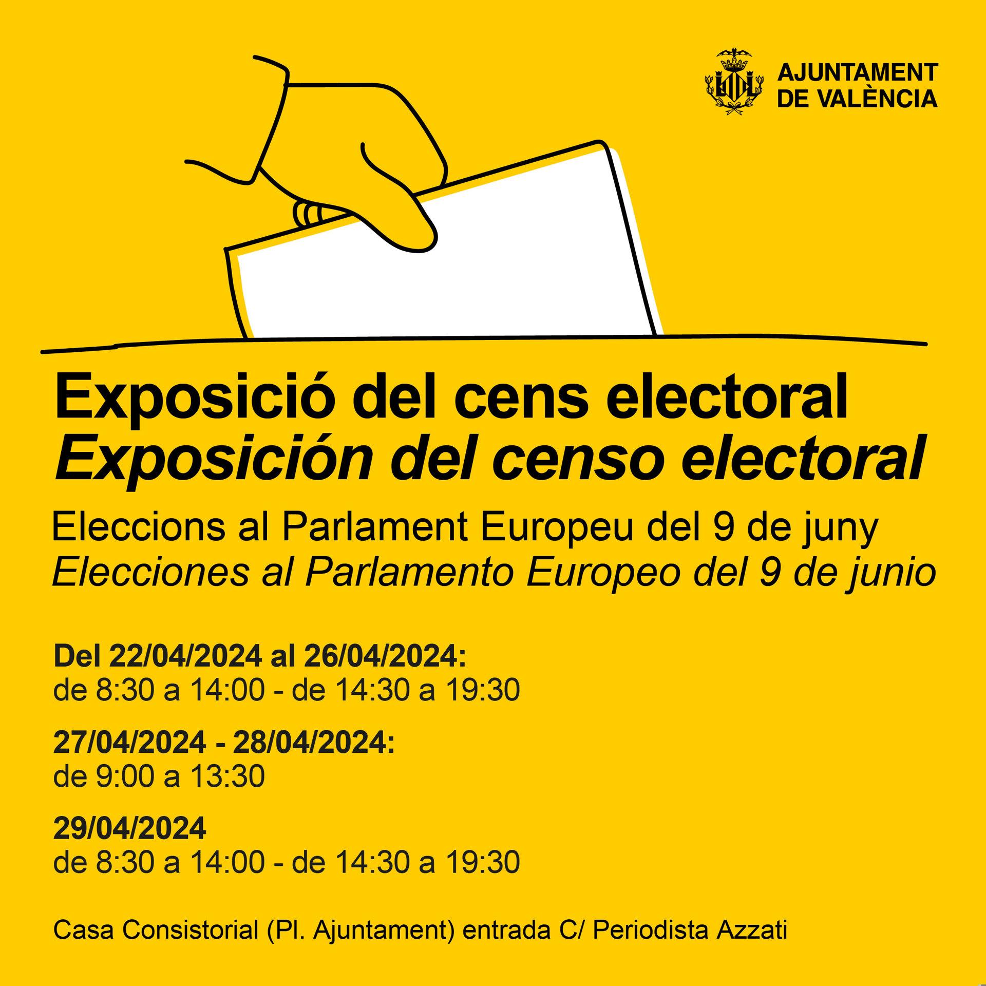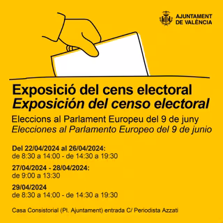 L'Ajuntament de València romandrà obert tots els dies del 22 al 29 d'abril per a la consulta pública del cens electoral de les pròximes eleccions al Parlament Europeu del 9 de juny i, en els casos que procedisca, per a poder presentar una reclamació.