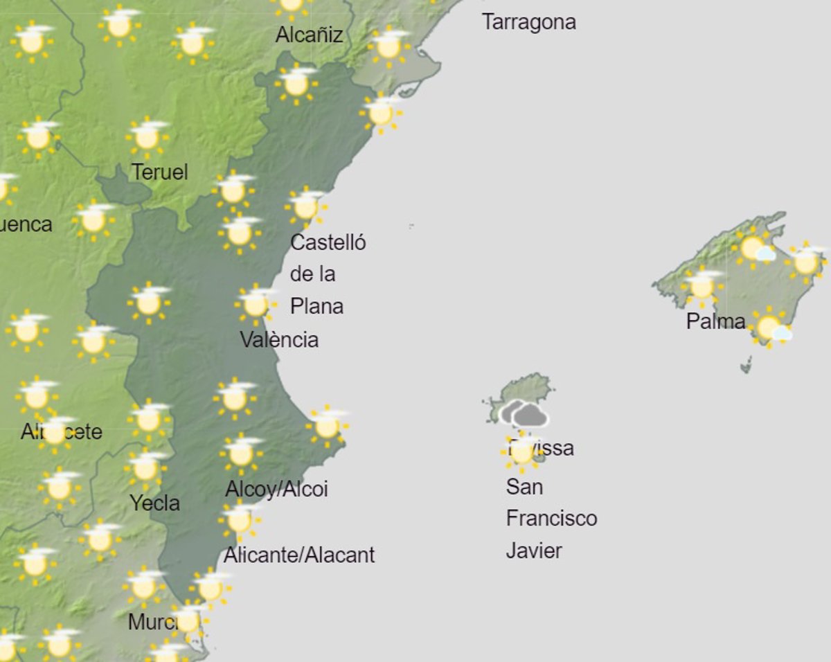 Així ho indica la predicció de l'Agència Estatal de Meterología (Aemet) per a aquest divendres, en el qual els cels es mantindran poc nuvolosos amb intervals generals de núvols alts i intervals de núvols baixos al litoral. També hi ha boires i probables bancs de boira matinals en punts del litoral.