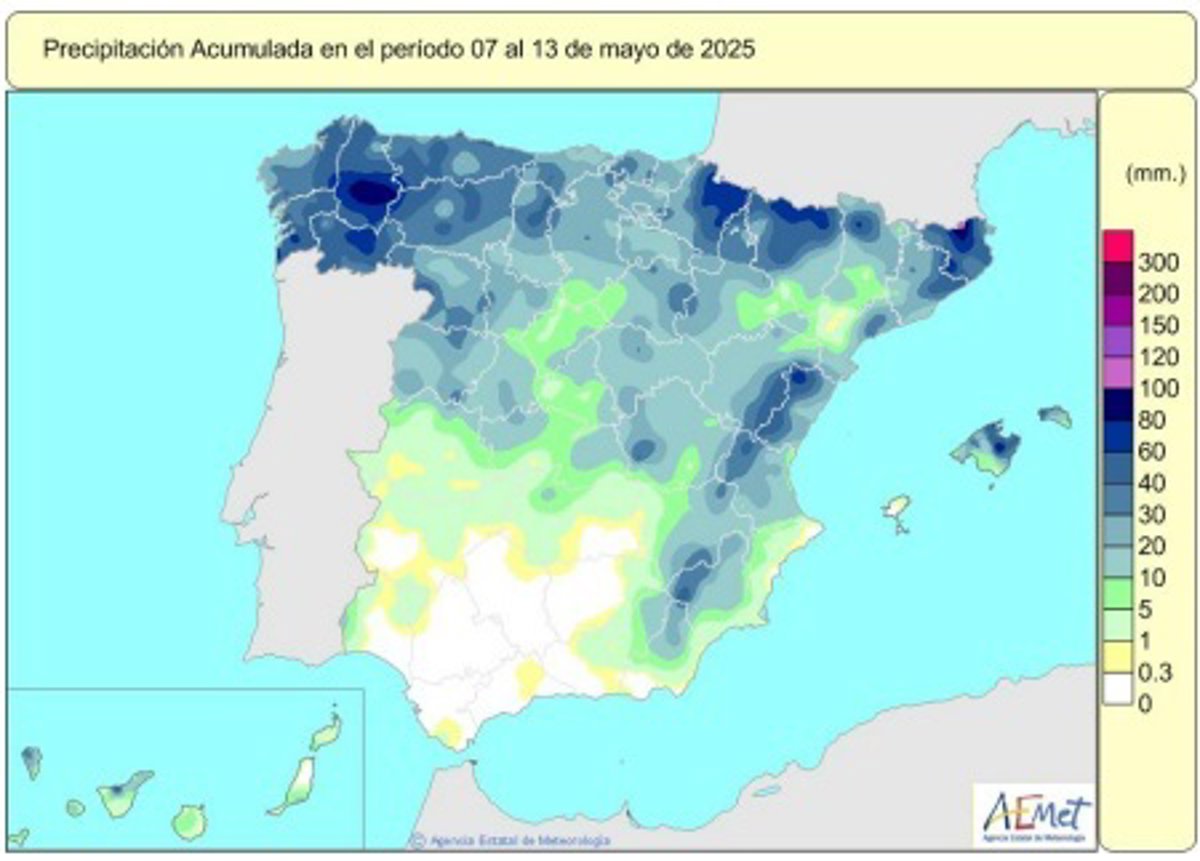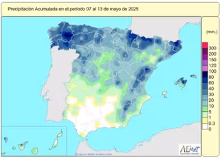 El valor mitjà nacional de les precipitacions acumulades des del passat 1 d'octubre del 2024 fins al 13 de maig del 2025 es xifra en 588 litres per metre quadrat (l/m2), segons dades de l'Agència Estatal de Meteorologia (AEMET) arreplegats per Europa Press. Això representa al voltant d'un 20 % més que el valor normal corresponent a este període: 490 l/m2.