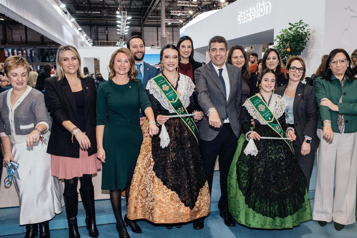 La reina de les festes de Castelló, Paula Torres, i reina infantil, Carla Ibáñez, han estat presentes este matí a la Fira Internacional de Turisme (Fitur) de Madrid i han fet lliurament de la polsera oficial de les Festes de la Magdalena 2025 al president de la Generalitat Valenciana, Carlos Mazón.