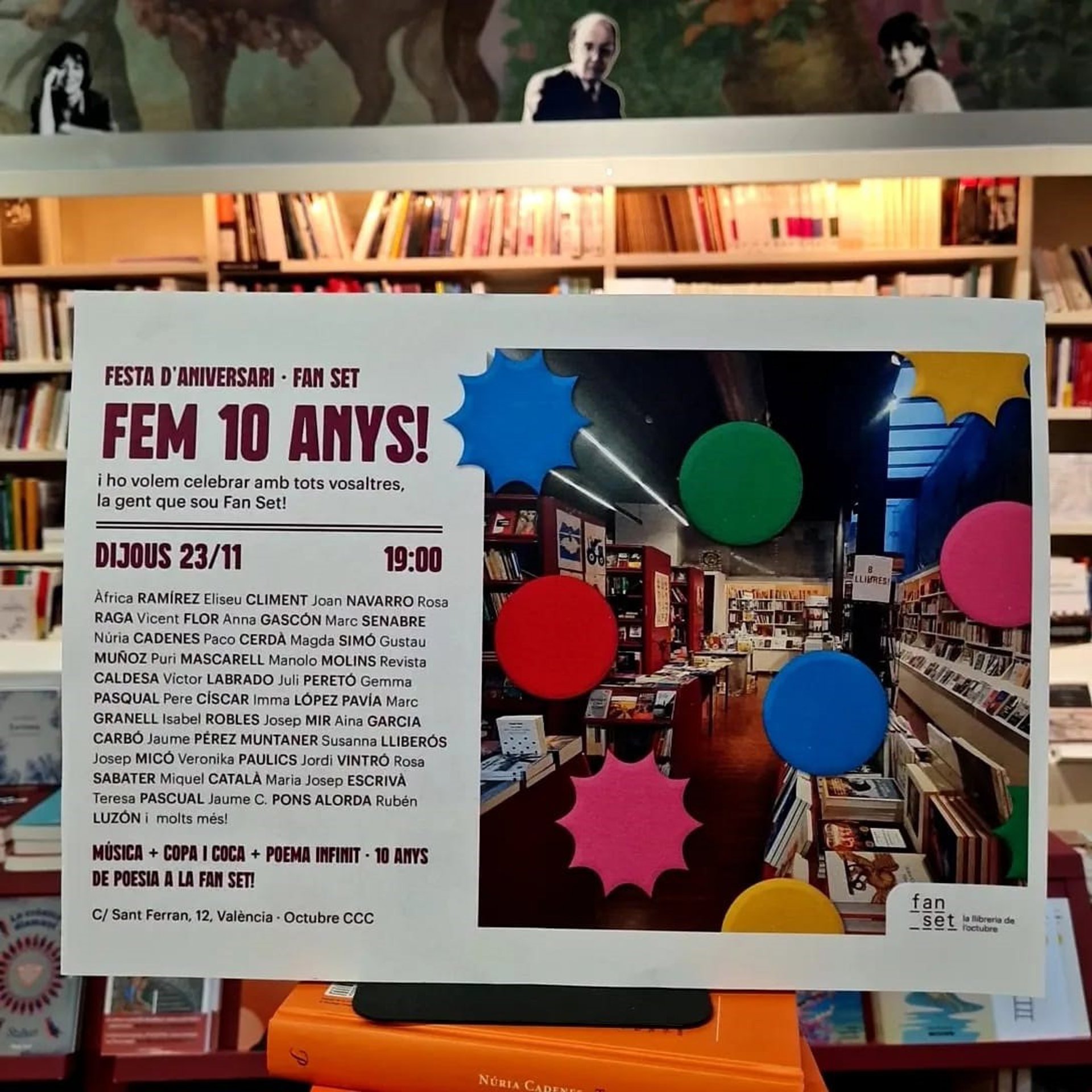 La llibreria Fan Set, situada en l'edifici Octubre Centre de Cultura Contempornia (OCCC) i que va nixer com a continutat de Tres i Quatre, l'"histric" establiment fundat per Eliseu Climent i Rosa Raga a Valncia, celebra deu anys amb una festa.