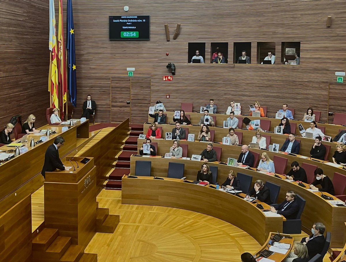 Després de la intervenció del síndic, els diputats del grup socialista s'han alat dels seus escons per a mostrar fotografies de persones represaliadas pel franquisme com el poeta oriol Miguel Hernández.