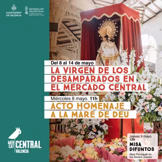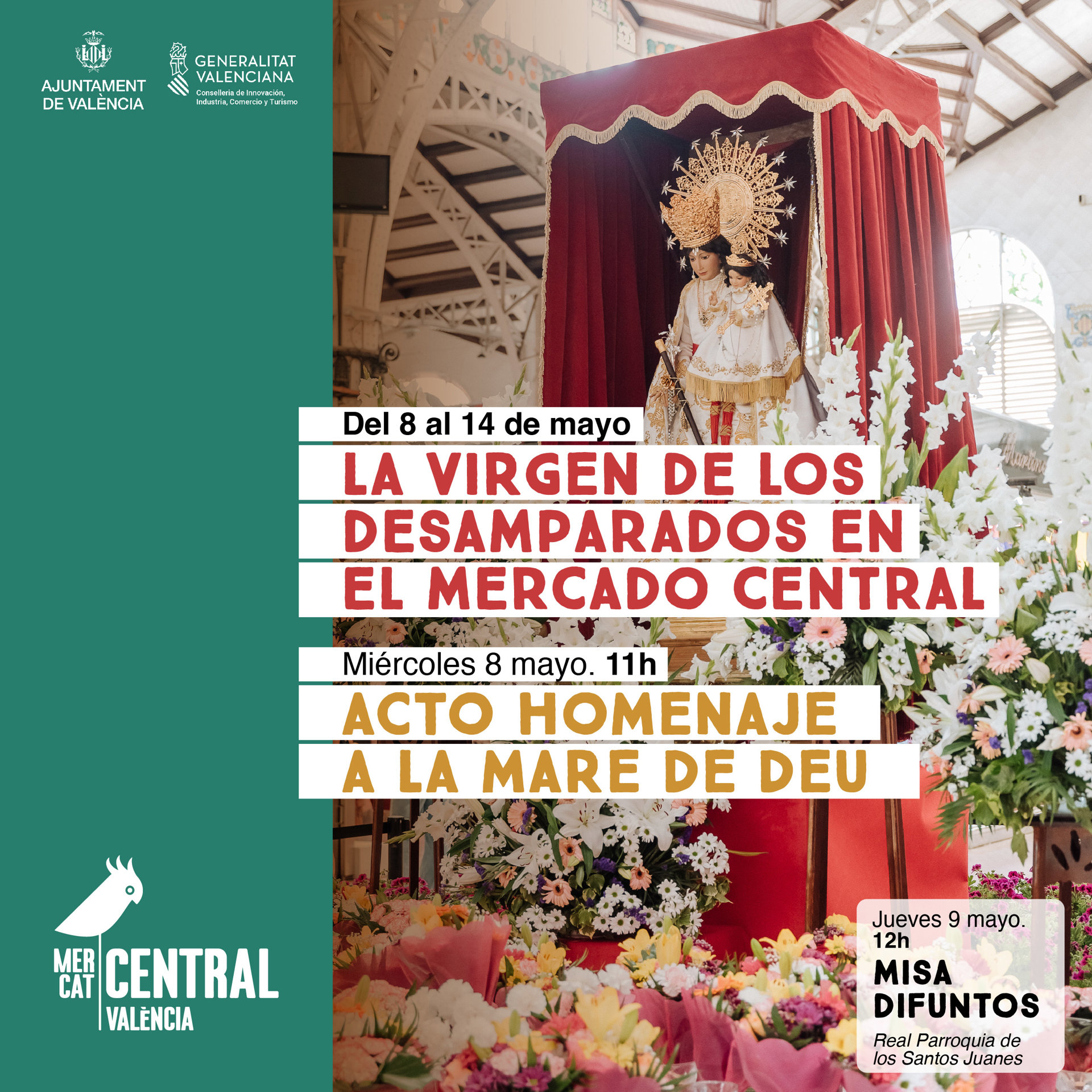 Els venedors del Mercat Central de València celebraran aquest dimecres 8 de maig la seua tradicional ofrena de flors a la Verge dels Desemparats, que es venera en el propi recinte, dins del programa d'actes organitzats per les Cambreres de la Verge del Mercat, amb motiu de la festivitat de la patrona dels valencians.