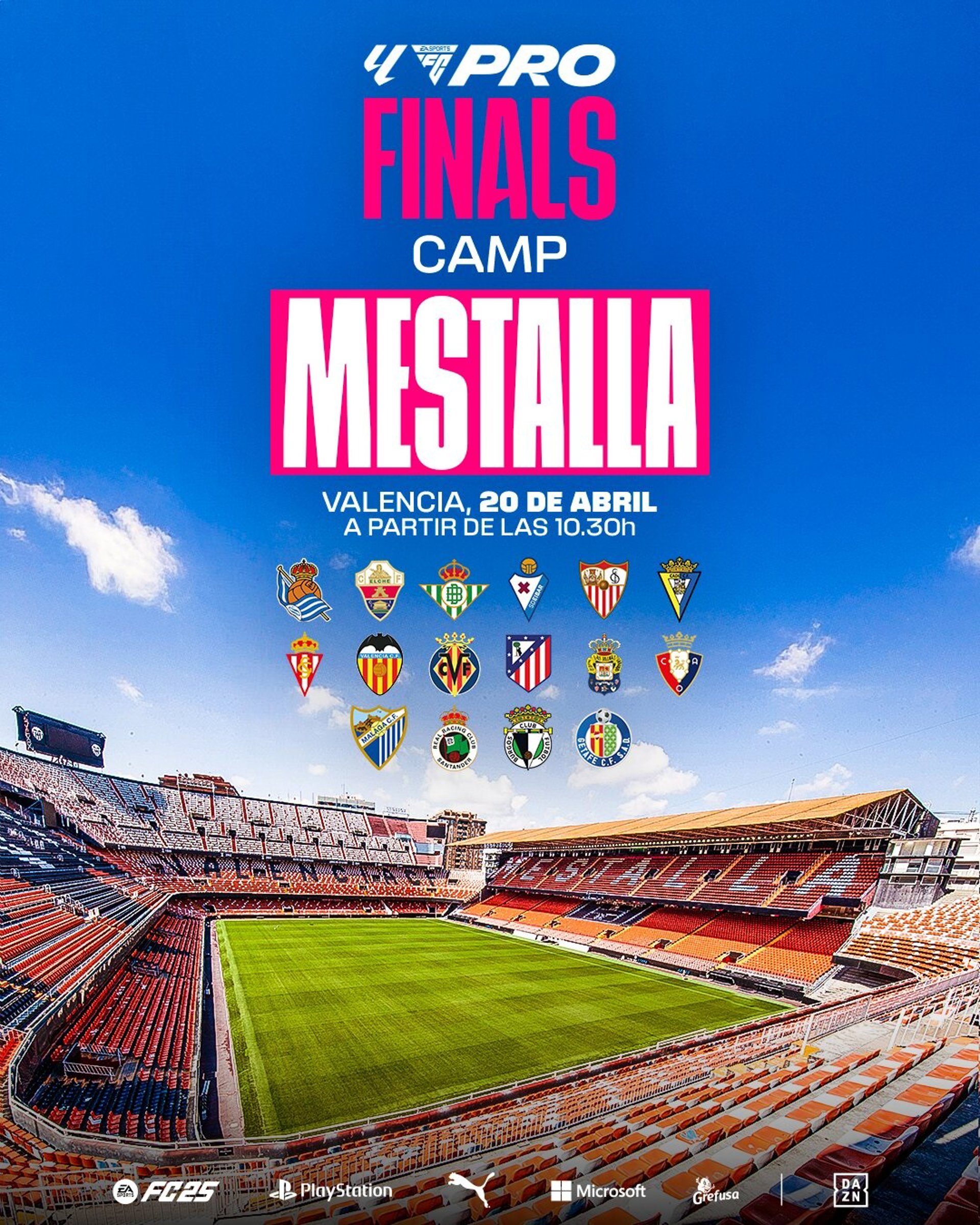 L'estadi de Mestalla acollirà la celebració de LaLiga FC Pro Finals en un gran esdeveniment obert al públic. Els aficionats que acudisquen a l'estadi des de les 10.30 hores podran gaudir de la disputa del títol de campió absolut de la temporada, conèixer els seus creadors de contingut favorits, com DjMaRiiO, llegendes de LaLiga com Fernando Morientes, participar en diferents activitats durant tot el dia i guanyar premis.
