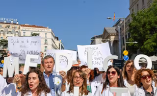 Així, amb bates blanques desenes de metges han protestat davant de la seu de Delegació de Govern a València entre xiulades, bombolles de sabó i batucades i portant taüts de cartó i pancartes amb lemes com 'r. i. p. professió mèdica', 'Exigim atenció mèdica de qualitat', 'Estatut mèdic propi', 'Defensem dignitat. Jornada laboral com els altres. Prou jornada complementària', '24 hores de guàrdia: zero cotitzades', 'Treball no és explotació' o 'Necessites metge en la banda del Peugeot?'.