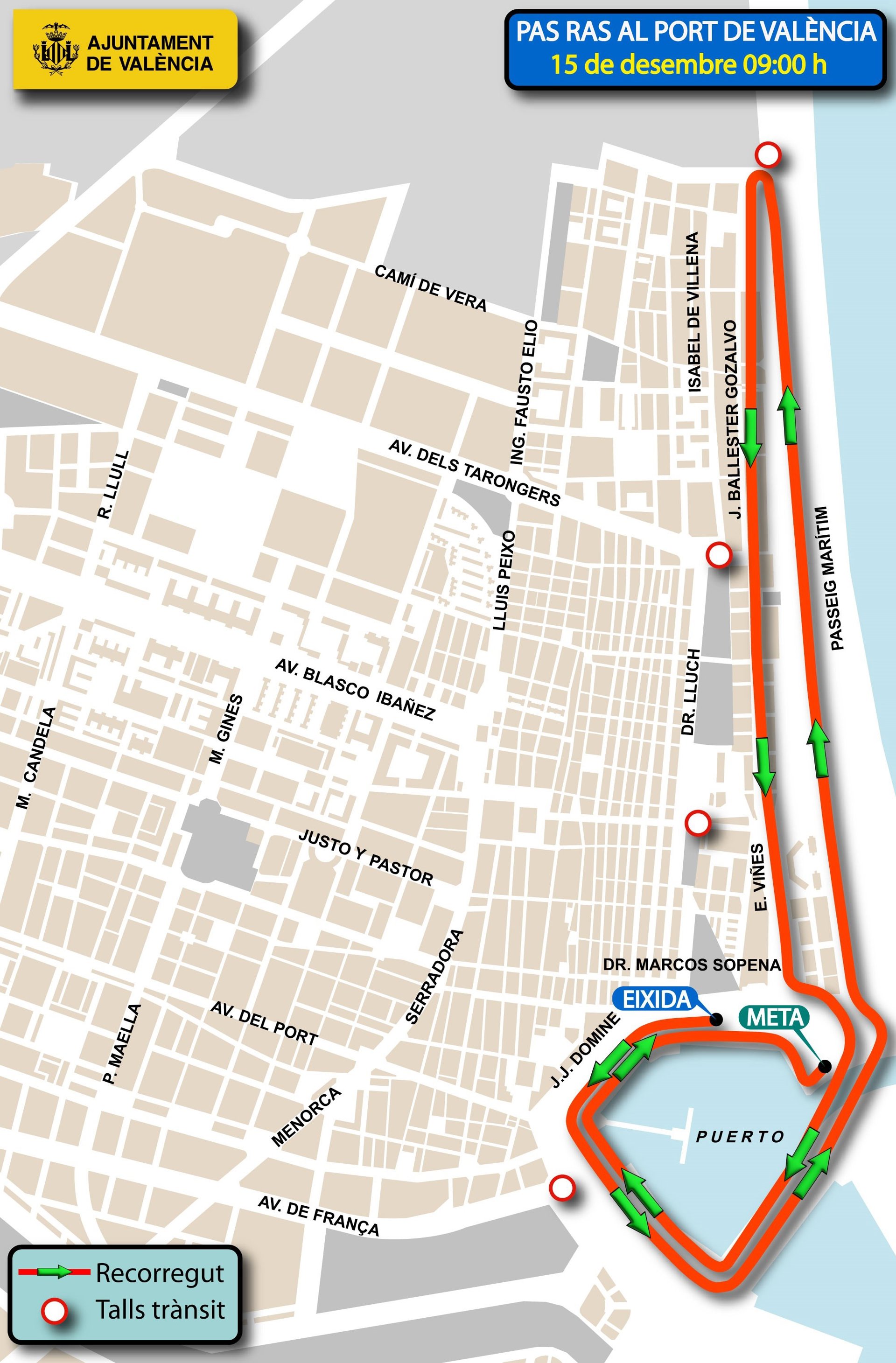 La carrera donarà començament a les 9 hores i està previst que concloga cap a les 10.30 hores. Atès que la major part de l'itinerari es desenvolupa per l'interior del Port de València, apenes es preveuen afeccions sobre el tràfic rodat.