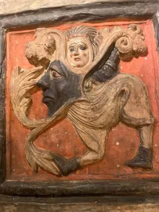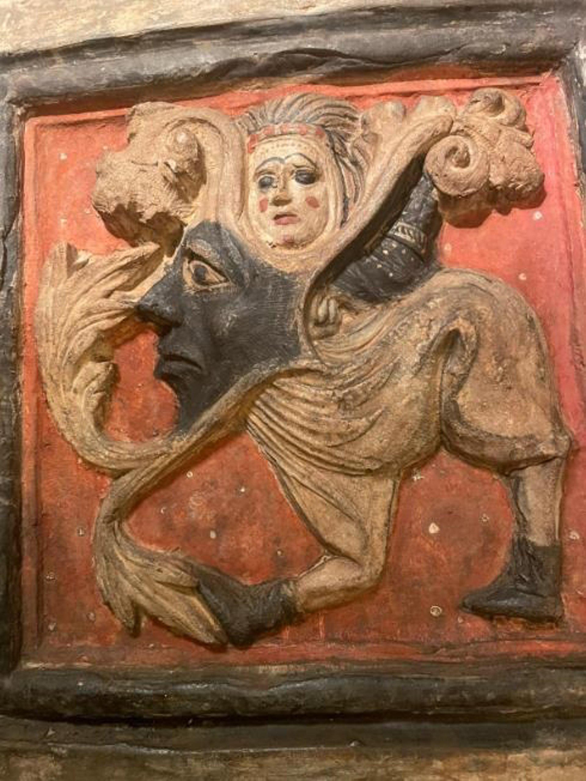 Encara que normalment es tracta de plaques planes, decorades a pinzell i sense vidriar, aquest "socarrat" és una placa amb relleu, que representa un grotesc, una gran mscara tocada amb un feix de plomes, amb cos, cames i peus, per sense braos i amb un rostre femení que ens mira, enigmtic, de front, ha detallat l'Ajuntament.