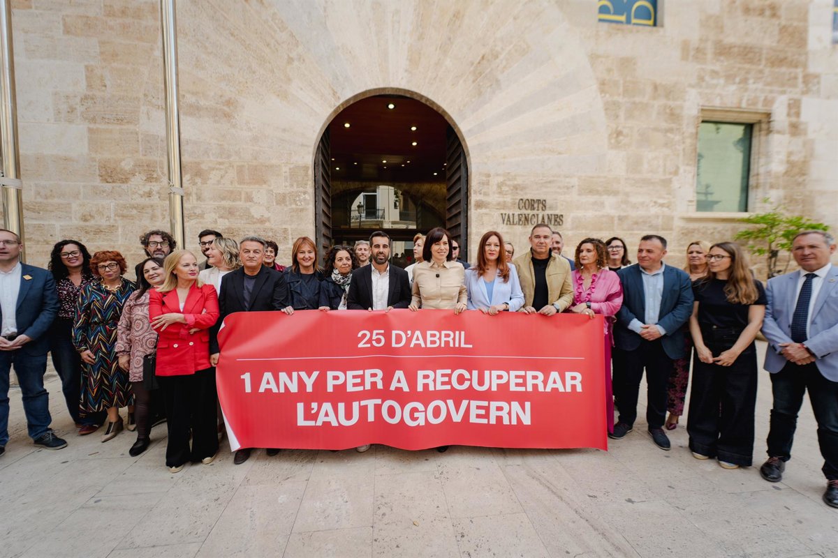 El PSPV ha portat este dijous a les portes de Les Corts Valencianes la celebració de la jornada del 25 d'Abril, dia en el qual tradicionalment el parlament valencià recordava la batalla d'Almansa i lliurava les altes distincions Francesc de Vinatea, i que no celebrarà en esta ocasió per segon any consecutiu. Els dirigents socialistes han desplegat una pancarta amb el lema '25 d'Abril. Un any per a recuperar l'autogovern'.