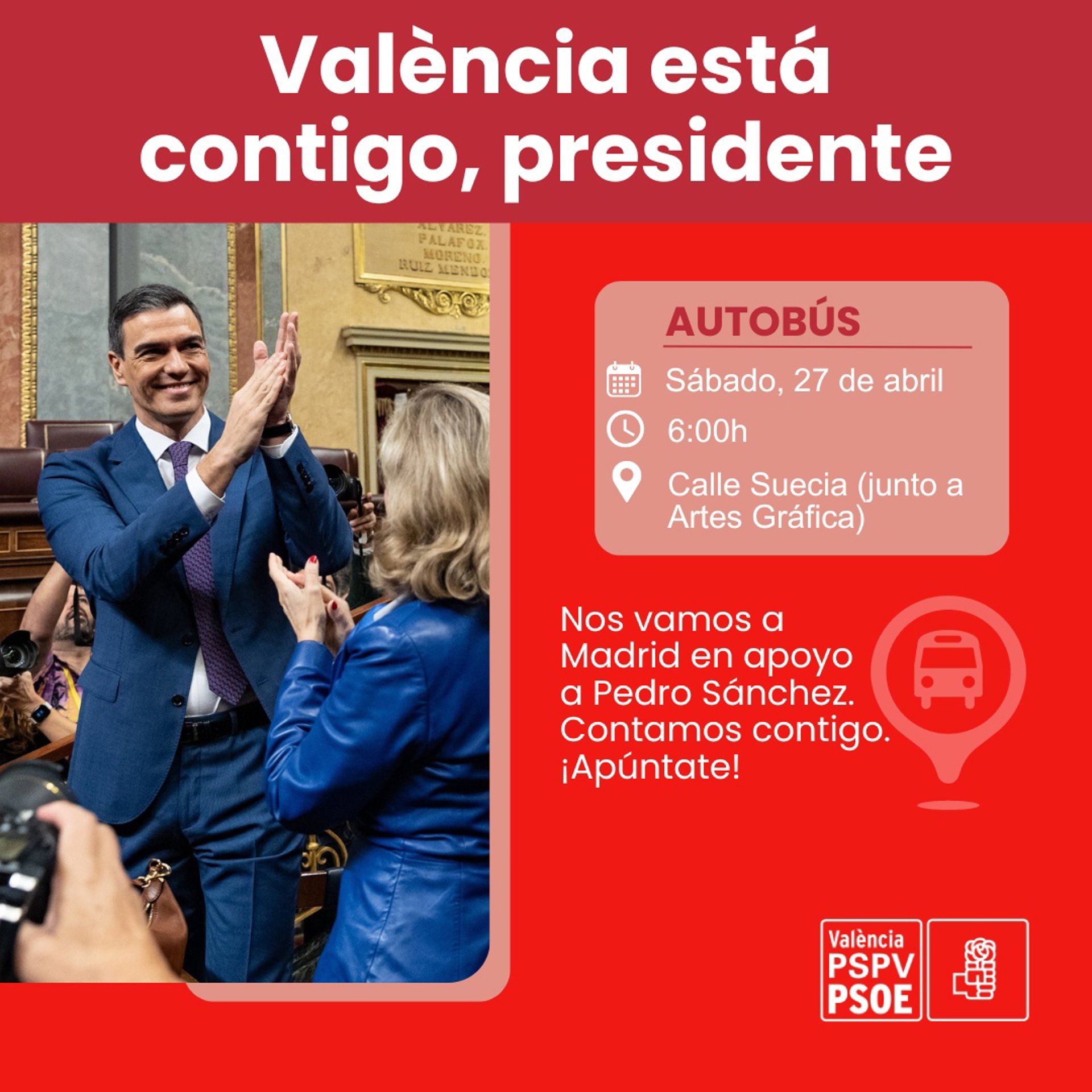 En el cas de Valncia, est programa l'eixida d'autobusos a les 6.00 hores des del carrer Sucia. "Valncia est amb tu, president", s'assenyala en la convocatria, en la qual s'anima a sumar-se a la iniciativa: "Ens anem a Madrid en suport a Pedro Sánchez. Comptem amb tu. Apunta't!".