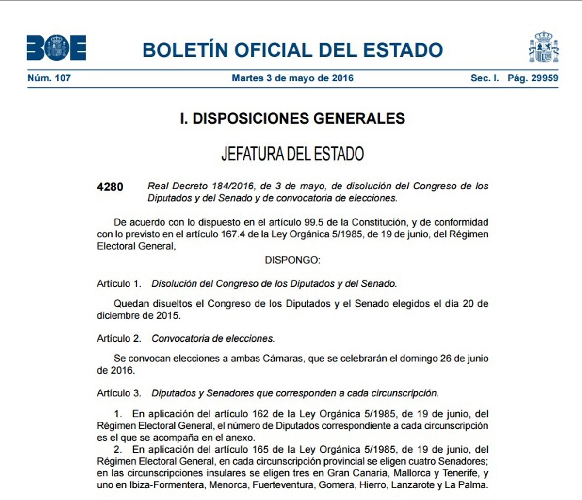 El Butlletí Oficial de l'Estat (BOE) ha publicat aquest dimarts el reial decret de dissolució de les Corts i de convocatria d'eleccions generals, firmat pel president del Govern, Pedro Sánchez i sancionat pel Rei, per al prxim 23 de juliol.