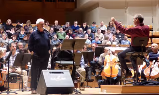Raimon està assajant a la Sala Iturbi del Palau de la Música, amb l'Orquestra de València i el Cor de la Generalitat Valenciana i baix la direcció del mestre Yaron Traub, el seu últim concert en terres valencianes.