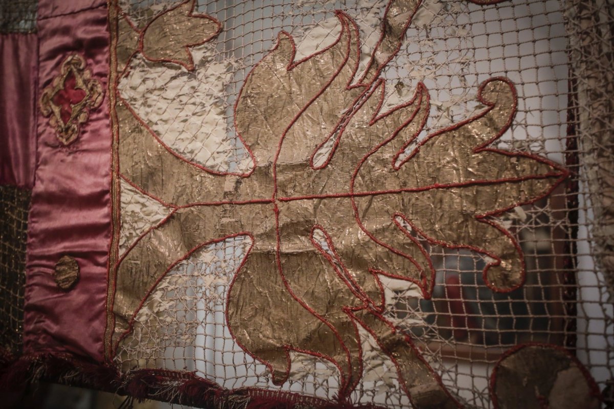 Prèviament, l'adjudicatària cosirà el nou lambrequín (l'adorn penjant ornamental d'heràldica que representa les cintes protectores de tela tallades) a la base de la rematada, i fixarà els cordons i les borles, de manera que queden correctament disposats.