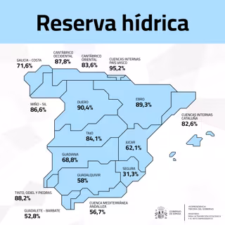 A nivell nacional, la reserva hídrica emmagatzema 42.410 hectòmetres cúbics, per la qual cosa es troba al 75,7% després de perdre 429 hm3 en una setmana. Totes les conques es troben per damunt del 50% excepte la del Segura, que està al 31,3%. De fet, nou estan per damunt del 80% i dos, per sobre del 90%.