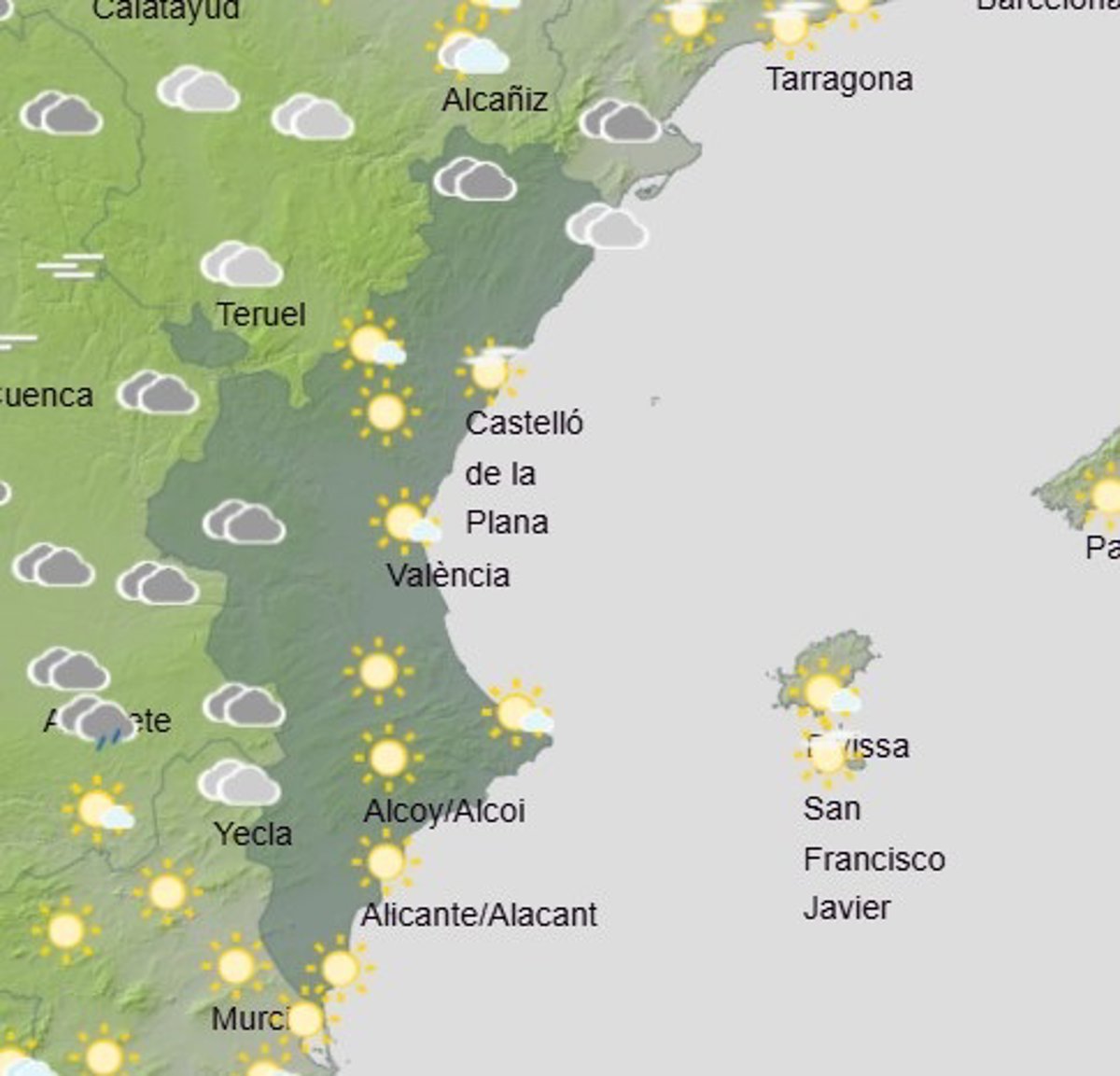 Les temperatures mínimes descendixen este dilluns en el litoral central i experimenten pocs canvis en la resta. Rondaran els 8-9ºC en les capitals provincials. Les màximes aniran en ascens i aconseguiran els 21ºC a les ciutats de Valencia i Alacant i els 17ºC a Castelló de la Plana.