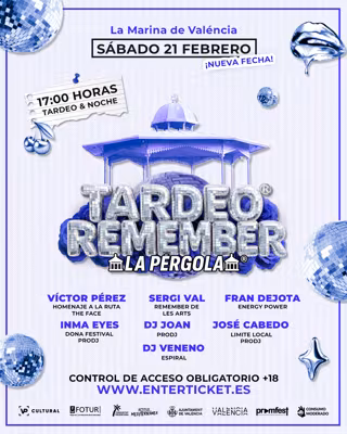 L'organització del Tardeo Remember La Pèrgola ha comunicat l'ajornament de l'esdeveniment previst inicialment per al 14 de febrer a causa de motius meteorològics adversos. La cita se celebrarà finalment el dissabte 21 de febrer en La Pèrgola de la Marina Nord de València, mantenint el seu horari habitual, des de les 17.00 hores i fins al tancament, vesprada i nit sense pausa.