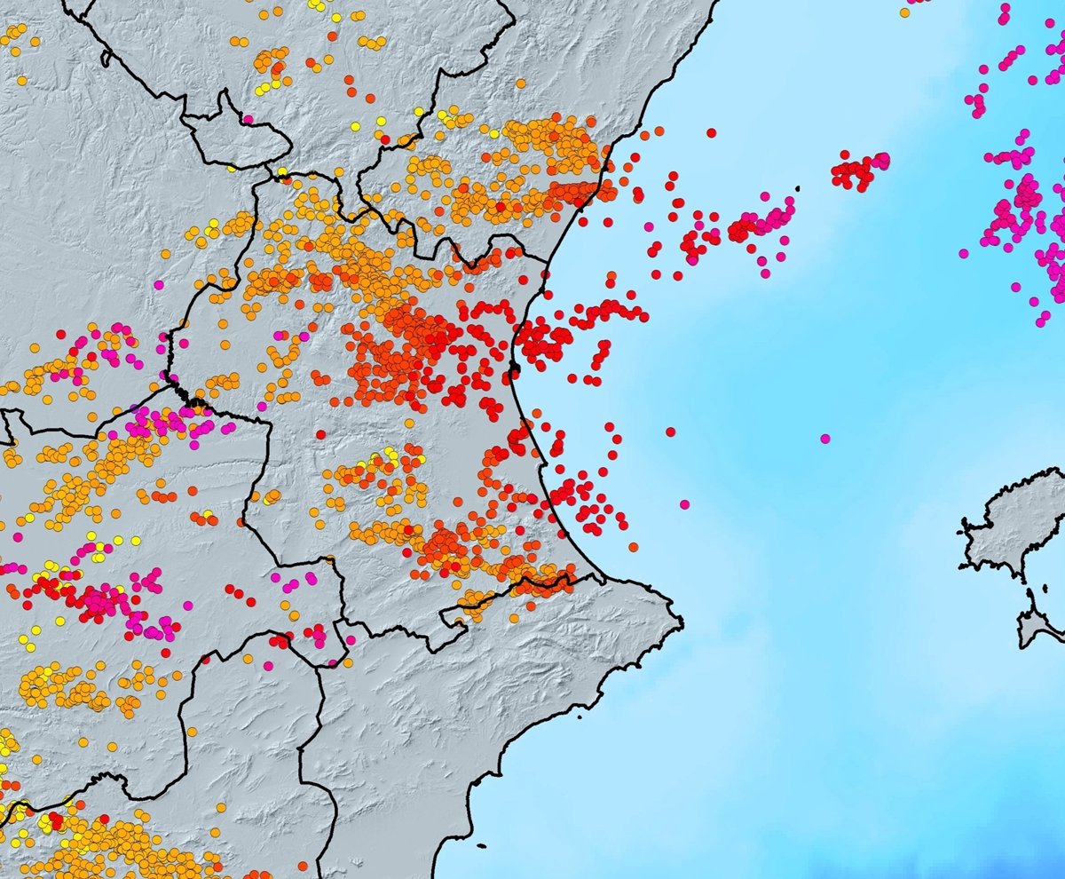La tempesta caiguda ahir dijous a la Comunitat Valenciana va deixar 1.432 descàrregues procedents de rajos que van impactar dins del territori: 1.018 a la província de València, 360 a la de Castelló i 54 a la d'Alacant, segons la informació facilitada per l'Agència Estatal de Meteorologia (Aemet).