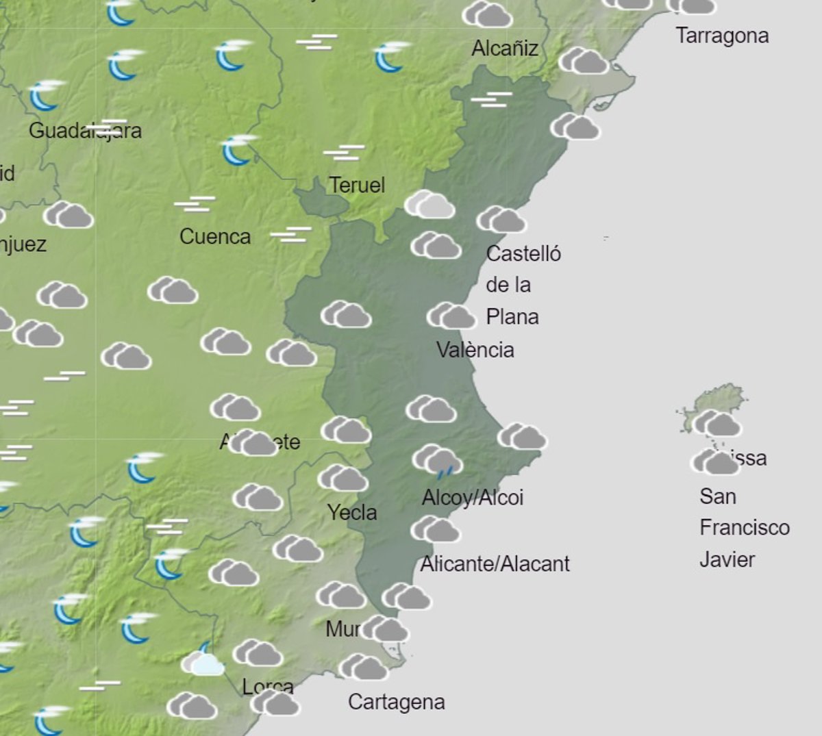Les temperatures no patiran canvis importants. Així, la ciutat d'Alacant anotar una mínima de 8C i una mxima de 17C; la de Castelló, de 10 i 17; i la de Valncia, de 9 i 16C.