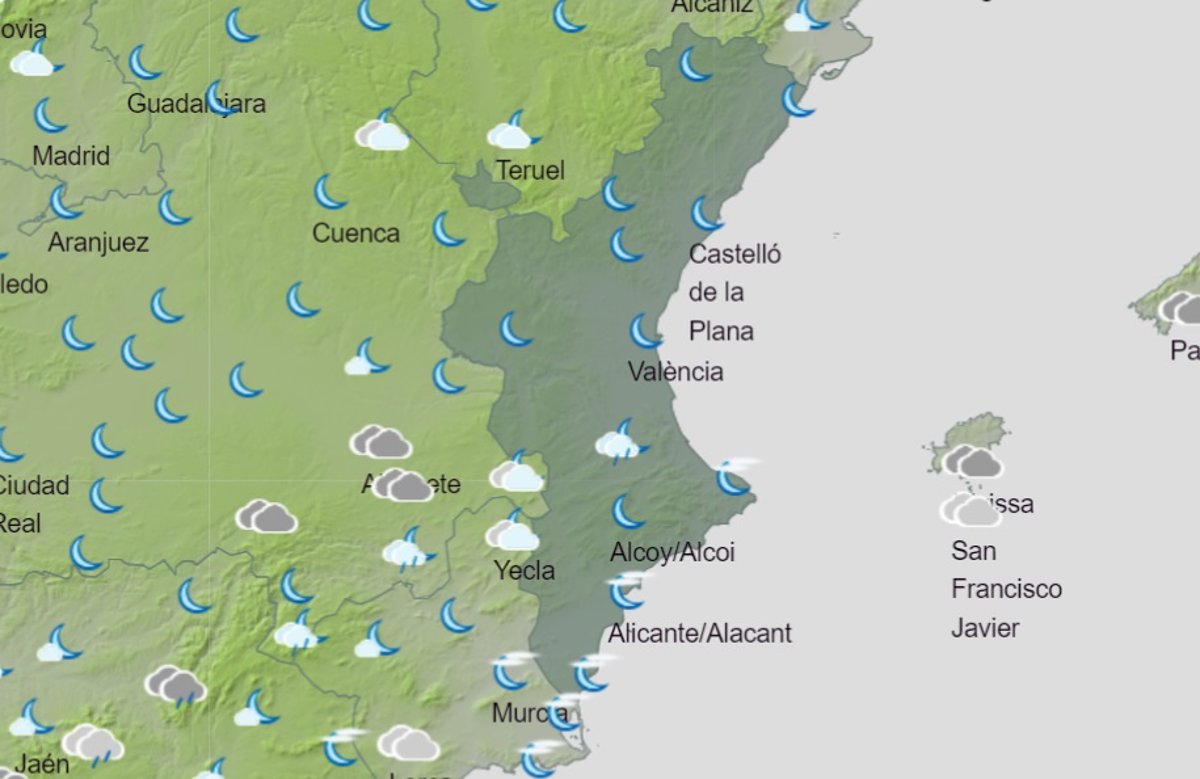 Les temperatures patiran un descens generalitzat, notable en el cas de les mximes --la ciutat d'Alacant anotar una mínima de 11C i una mxima de 20; Castelló, de 9 i 20; i Valncia, de 12 i 20C--. També s'esperen gelades febles en punts de l'interior nord de l'autonomia.