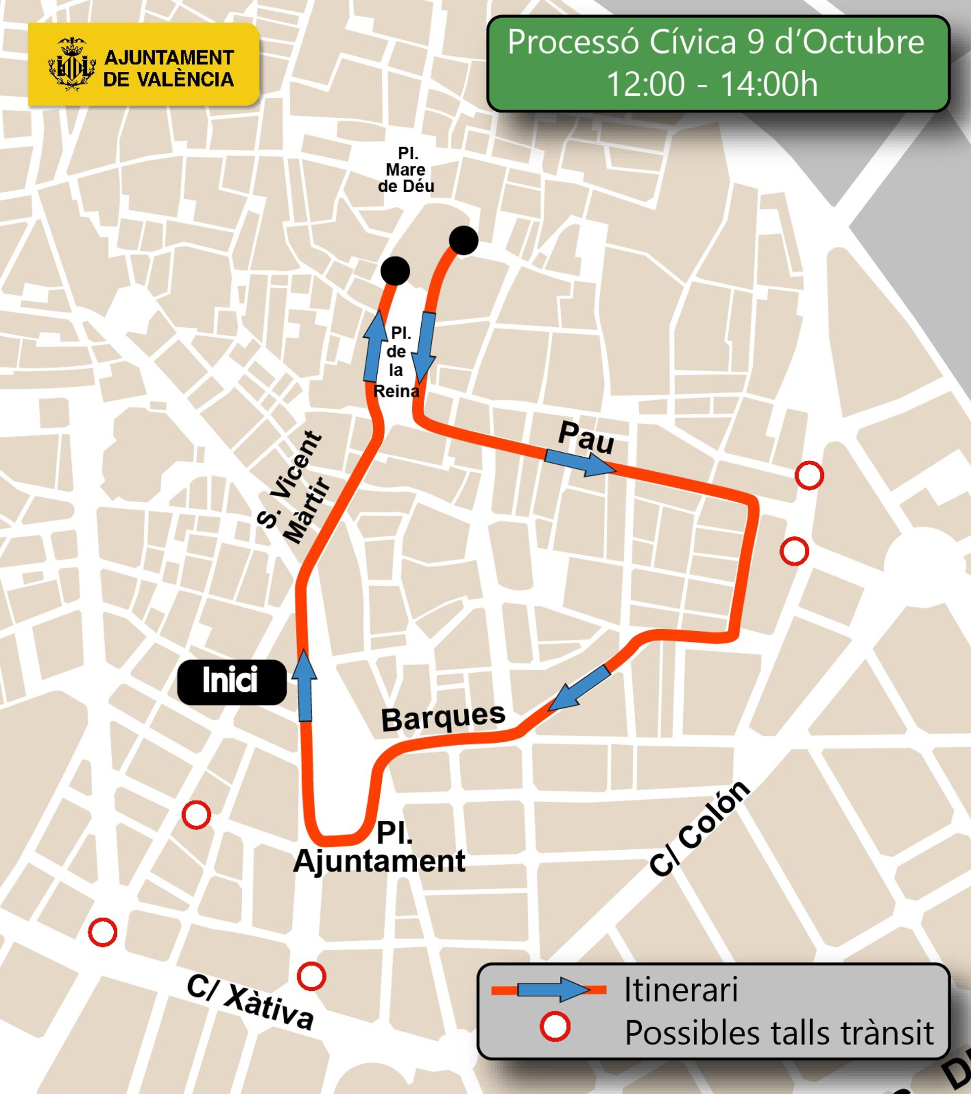 L'Ajuntament de València engega un dispositiu especial de trànsit, a partir la nit d'este dilluns, amb motiu de la commemoració del 9 d'Octubre. Estes activitats, que conclouen este dimecres, implicaran talls al trànsit i afeccions en la circulació al centre de la ciutat i al pont de Monteolivete.