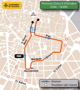 Els actes del 9 d'Octubre previstos començaran a les 12.00 hores amb la baixada de la Senyera, la Processó Cívica i l'ofrena floral a Jaume I el 'Conqueridor' al jardí del Parterre. L'itinerari transcorrerà per la plaça de l'Ajuntament, el carrer Sant Vicent Màrtir, la plaça de la Reina i la Catedral de València, on tindrà lloc el Te Deum.