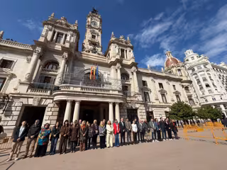L'alcaldessa de València, Mª José Catalá, acompanyada de regidors i regidores dels quatre grups polítics que conformen la corporació --PP, Compromís, PSPV i Vox--, han guardat un minut de silenci a les portes de la casa consistorial, en la plaça de l'Ajuntament, en record de les víctimes del 11M i també amb motiu del Dia Europeu de les Víctimes del Terrorisme.